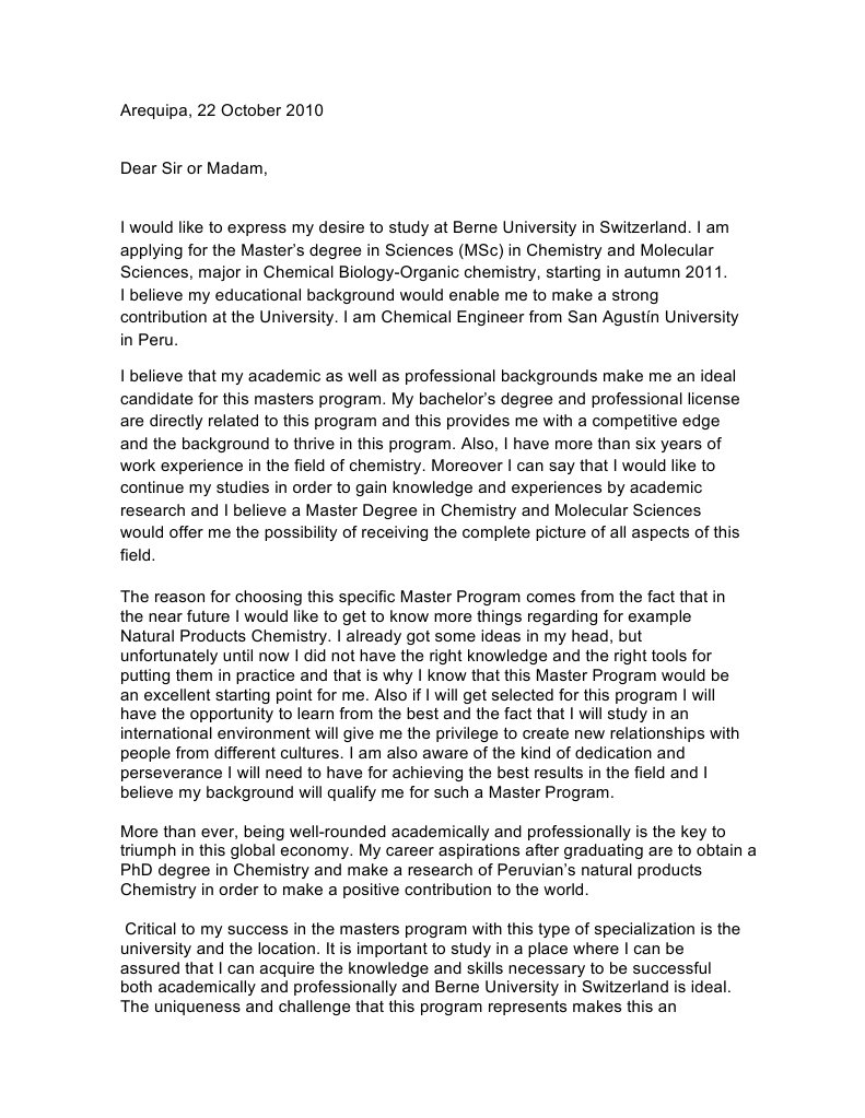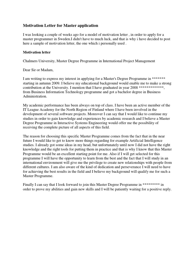 (application required 3 letters of recommendation, cv,. Motivation letter for masters sample this motivational letter is asked by the institution so that they can asses, as if what is motivating you to study the particular master's program so that you can be granted the admission there. Obtaining a letter of motivation for a masters degree is an important aspect to build one's career path and secure a good job after its completion. Motivation letter sample for a master in hr last week we have received an inquiry from our reader in belgium, who wishes to apply for a master in hr management. I hope that you can help fix errors in the letter as soon as possible since the deadline for application is on april 27.